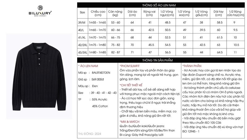 Áo len cổ polo thiết kế, (Đen , 40)