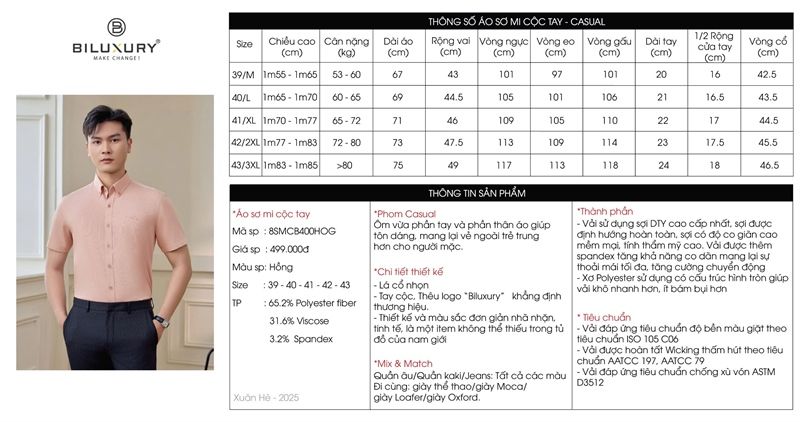 Áo sơ mi cộc tay cơ bản (Hồng, 39)